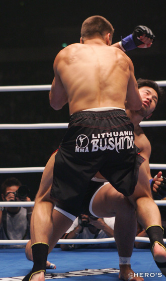 勝っておかしいかもしれませんが、村浜選手のビデオをリトアニアで見てきて、その時はレスリングタイプの選手だと思っていたんですが、日本に来て実はシュート・ボクシングの代表選手だと知りまして、もう1回彼の試合を見たんですが、彼は立ち技でも優れた選手だと分かりました。そこで、彼に対する見方を変えて、とにかく打撃戦になると思いました。