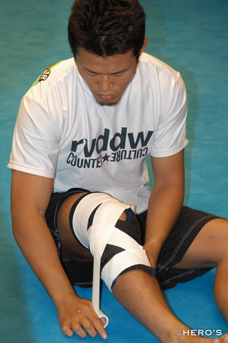 負傷した右ヒザをガッチリとテーピング。足をケガした分、パンチの練習ができたとのこと