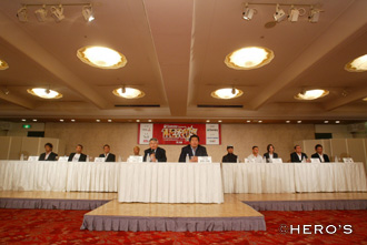 その後、今大会の目玉となるミドル級トーナメントに出場する、宮田和幸、須藤元気、高谷裕之、レミギウス・モリカビュチス、山本“KID”徳郁、ホイラー・グレイシー、所英男、宇野薫、そして前田日明スーパーバイザーと信国一朗氏(株式会社TBSテレビ事業本部事業局長)が登場。信国氏と前田スーパーバイザーが挨拶をし、出場選手それぞれが意気込みを語り、報道陣による質疑応答がなされた。