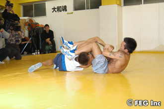 やはり、バックボーンであるアマレスが一番の拠り所になるのか、この日、KIDが公開練習で見せたのは、長年培ってきたアマレスを主体としたスパーリングだった。前半は感覚を確かめるように、丁寧にタックルの入り方をチェック。体が温まってくると、テイクダウンからグラウンドの攻防に移り、関節技を披露した。それもそのはず、KIDは母校・山梨学院大の監督に誘われ、ここ2カ月程、同大学でのレスリング特訓を敢行。1週間おきに山梨に滞在し、グレコローマンスタイルとフリースタイルの練習で、レスリング漬けの日々を過ごしてきた。1週間を山梨でレスリング特訓に励めば、次の1週間は東京に戻ってきて打撃の特訓。そして、また山梨へとのハードスケジュールで、大晦日決戦に備えている。