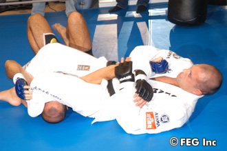 会見が終わると公開練習。縄跳び、ストレッチで入念に体を温めると、所戦を想定してか、体格が所とほぼ一緒のホイラー、自分と同じくらいのホドリゴ・グレイシー、その他1人と計3人を相手に、試合時間と同じ10分2Rのスパーリングを披露。「ううう~」という奇妙な呼吸音を発しながら、みっちりと体を動かし、コンディションの良さを報道陣にアピールした。この寸分の隙もないホイス相手に、所はどのような勝負を挑むのか?■