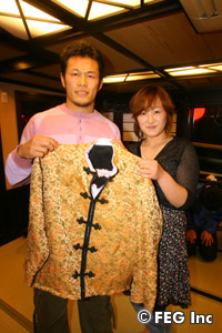 須藤は貴重なアイテムにサインを入れて、ファンにたっぷりとプレゼントした。これは3月のオーレ・ローセン戦の前に、練習衣として使用していたというカンフー衣。試合当日に着用したのと同じ形という、ファン垂涎の品だ