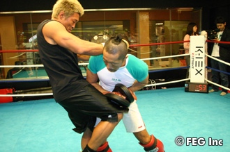 この試合を、ただの異種格闘技対決では終わらせない。道衣を脱ぐ可能性を示唆したことに対する決意表明のように、彼はあえて打撃戦を挑む姿勢を強調した。彼は今、山田武士トレーナーと二人三脚で打撃の強化に励んでいるという。3月の石澤常光戦の前にも山田トレーナーとの公開練習でハイレベルな打撃を見せていた秋山だが、この日はさらに鋭さを増していた。右ストレート、左フック、ヒザ蹴り、パウンド…。寝技で勝負を仕掛けるためにやっている、付け焼刃レベルの打撃ではない。そのどれもが、相手を確実にKOしそうなインパクトを残していた。