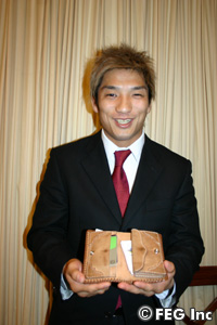 盟友のレミギウスが4・5MAXで魔裟斗に善戦したこともあり、「すごく刺激を受けました」とモチベーションが上がっている所(手に持っているのは最近ゲットした自慢のお財布)