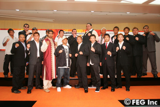 いよいよ決戦の前日。5・3HERO'Sへ向けて、出場全選手が一堂に会した。秋山成勲、所英男、宇野薫、永田克彦、曙、ドン・フライ、期待の大型ファイターのアントニオ・シウバなど、彼らが並ぶだけで言葉を失うほど豪華なメンバーが揃っている。