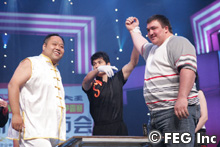 この日は、公開計量もあり、選手はともにパス。決戦へ向けて、中国ではかなり盛り上がっている。公開計量が終わると、なんとアランが腕相撲3番勝負に臨むこととなった。地元の腕相撲大会優勝者が登場し、アランを睨み付ける。だが、アランは余裕の表情。さすがは、腕相撲世界チャンピオンだ。