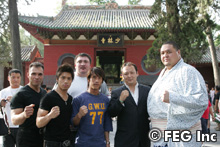 少林寺総本山の前で。チーム・ドラゴンの前田憲作代表も同行した