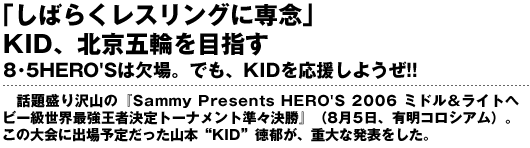 「8月5日のHERO'Sは、山本“KID”徳郁選手がレスリングで2008年の北京オリンピックを目指すことになりましたので、欠場となります」
