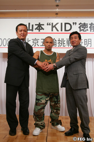 「主催者としては複雑な心境ですが、HERO'Sの王者となって、これから名声と収入を得ていくそういう時期に、あえて困難な道を選ぶのは、男として格闘家としてもカッコいい。やるからには、日本代表となって、北京でメダルを獲ってもらいたいですね。全面的に応援していきますし、北京まで行きたいくらいです」と谷川代表。前田日明スーパーバイザーも「思いがけずKID選手が、オリンピック挑戦の表明をしましたけど、今までに見たことがない凄い奴ですね。出来る限りのサポートをしていきたい」とKIDの決意を支援した。