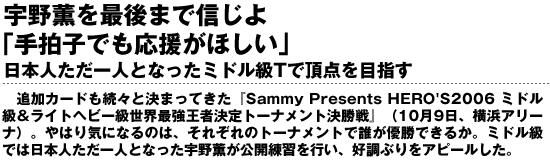 10・9HERO'S横浜アリーナ大会でのミドル級トーナメント決勝ラウンドへ向けて、宇野薫が練習を公開。日本人が一人しか残っていないため、記者から声援は何がいいのか訊かれたのだった。予想をしていない質問だったのか、白い歯を見せていた宇野だが、やはりファンの声援は大きな力になるのだろう。手拍子でもいいからという言葉は、みんなのパワーが少しでもほしいと願っているようでもあった。