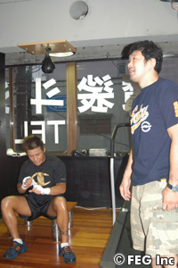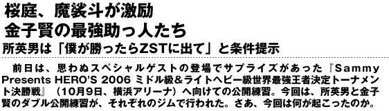 ジムで練習していた魔裟斗と桜庭が対面。魔裟斗が金子に声をかける場面もあった