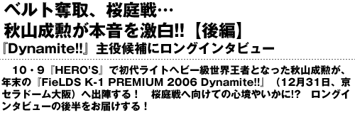 違いますね。桜庭さんを倒してベルトを獲るのと、ワンマッチはちょっと違うんです。トーナメントのときは、それを考えてやっていたんですけどね。自分が決勝で負けていれば別ですけど、こうやってベルトをもらっていろいろと考える立場になれば、闘う意味が変わってきます。