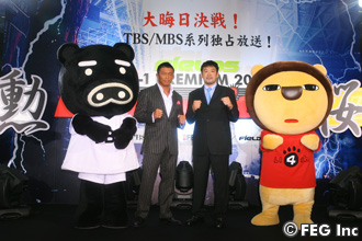 10月23日の記者会見より。TBSとMBSのキャラクター君たちと一緒にファイティングポーズ!