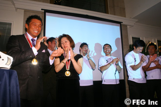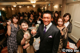 そんな緊張気味の秋山をよそに、パーティーはスタート! 抽選で選ばれたファンが「秋山選手の優勝と前途を祝して、カンパ〜イ!!」と、乾杯の音頭をとると、会場からは拍手喝采。秋山は細い目をさらに細くして笑顔満面!