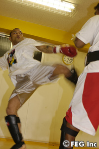 鋭い蹴りを披露したKID。この蹴りをもらえば、いかに金メダリストでも、立っていられないだろう
