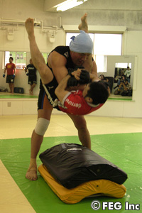 続いては、相手を持ち上げてマットへ叩き落す、投げ技のバスターを披露。この技は、ボビーと体格が似ているということで、正道会館の全日本ウェイト級準優勝者の地主正孝が務めた。地主が下から三角絞めを狙うと、ホンマンはそのまま高々と抱え上げる。