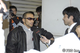 TV局のインタビューに応じるKID。待ち受ける報道陣には元気に一言「アディオス!!」