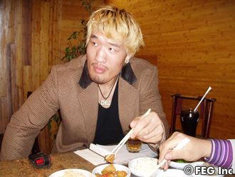 焼肉屋でキムチを食べてホッとするホンマン。キム・ミンスも一緒だぞ(6・2『Dynamite!! USA』に出場か!?)