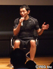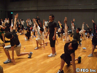この日は、宇野も指導を受けるトータル・ワークアウトの池澤智トレーナーが、体幹部分(胴体、腰、太もも、など)を中心にしたトレーニングメニューを紹介。太ももをふり上げての歩行や、うつ伏せたまま片足を上に上げる運動、ジャンプし着地の際にゆっくりヒザを曲げる運動などが紹介され、参加者がそれらの運動を実践した。