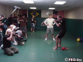 多数の報道陣が詰めかける中、シャドー、ミット打ち、打撃&寝技のスパーリングを披露したホイス。ミット打ちではトレーナーの構えるミットに小気味のいい音を立てながらパンチ、キック。スパーリングでは得意の寝技でスパーリングパートナーを圧倒した。