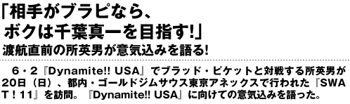 『Dynamite!! USA』に向け、渡米を2日後に控えた所英男が、渡米直前の心境を語った。渡米後のスケジュールについては「分かりません」と語るが、「最悪、ミットを持っていって、ランニングができれば」と調整についてはあまり気にしていない様子。「今日までの調整もうまくいったかと言えばうまくいったかもしれませんが、うまくいかなかったと言えばそうかも(笑)」と自然体過ぎるコメントを発した。