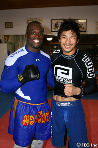 メルヴィン・マヌーフが、所英男とタッグを組んだ。いよいよ4日後の開催まで迫った、『SoftBank presents Dynamite!! USA in association with ProElite』(6月2日=現地時間、アメリカ・『ロサンゼルス・メモリアル・コロシアム』)。各出場選手が続々と現地しているのはお伝えした通りだが、階級の違う選手との技術交流が盛んに行われているようだ。