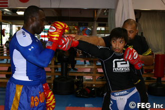 グローブをはめた二人は、軽くマススパーからスタート。ジャブからのローキック、ジャブからのハイキック、右ヒザ蹴り→左フック→右ローキックとコンビネーションを増やし、交互に繰り出していく。二人ともゆっくりと動き出し、試合までの調整を加減しながらやっているように見えた。