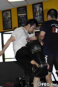 ブラジルのシュートボクセで練習を積んできた桜庭は、日本へ帰国して、22日は現地入り。3日間のメディカルチェックを受けて、ロスの『シュートボクセUSA』で練習を続けているという。試合直前だが、桜庭は調子がいいのか、高橋を極めまくり、ミット打ちでも鋭いミドルキックを連発させていた。これも、シュートボクセでの練習の成果なのだろう。