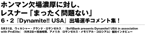いよいよ2日後に迫った『SoftBank presents Dynamite!! USA in association with ProElite』(6月2日=現地時間、アメリカ/ロサンゼルス・メモリアル・コロシアム)。この日は恒例の個別会見が行われた。同日に行われた記者会見で明らかになったチェ・ホンマンの欠場濃厚に関し、対戦の予定されていたブロック・レスナーはどんなことを語ったのか?
