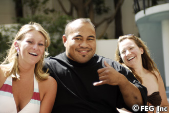 一方、『Dynamite!! USA』へ向けて絶好調をアピールしていたのは、我らがマイティ・モー。今日はプールサイドで美女たちの注目の的に☆