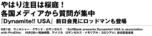 いよいよ開催が明日に迫った『SoftBank presents Dynamite!! USA in association with ProElite』(6月2日=現地時間、アメリカ/ロサンゼルス・メモリアル・コロシアム)。この日は恒例の前日会見が行われた。アメリカ、日本、韓国など、世界中から多数駆けつけた報道陣の注目は桜庭和志。リビング・レジェンドへの注目の高さがうかがえた。