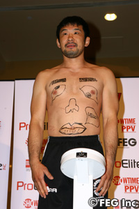 また、この日は、会見終了後に公開計量も行われたのだが、ここでの主役もやはり桜庭。秤の前でTシャツを脱いだ桜庭のお腹には、なんとお茶目な顔が描かれていたのだ。秤に乗った桜庭はお腹をクネクネさせ、報道陣になんと腹芸を披露! 報道陣を笑わせた桜庭は、満足気な表情を浮かべると計量会場を後にしたのだった。■