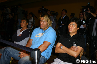 7年前の2000年5月1日に“伝説の90分”と呼ばれる激闘を演じた桜庭とホイス。そんな両者に対し「7年前の試合と比べて、今回は特別な準備をしたか?」との質問が飛ぶと、ホイスは「違う技、そして今回は時間制限があるので、違う作戦も用意しています」と返答。桜庭は「視力のトレーニングをしてきました」と、カリフォルニア州アスレティック・コミッションのメディカルチェックにいささか辟易した様子をうかがわせるコメントを残した。