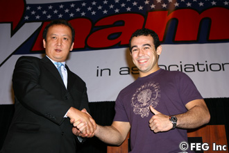 記者会見では、ブラジリアン柔術のマルセロ・ガッシアが登場。FEGの谷川代表と向かい合い、ガッチリと握手をした。ガッシアは3年連続でアブダビコンバットの77kg未満級を制覇した世界屈指のグラップラーで、2003年にはビトー“シャオリン”ヒベイロをスリーパーで失神させている。