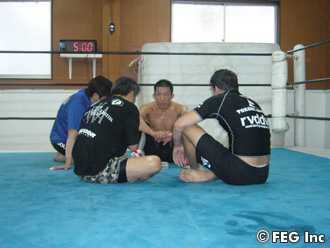 そのフィッチと共にリングに上がった永田は、5分2Rのマススパーリングを公開した。永田は、随所でフィッチからアドバイスをもらい、グラウンドでのポジショニングを入念に反復練習。豪快な反り投げや、兄でありプロレスラーの永田裕志選手の得意技、ナガタロックも披露した。