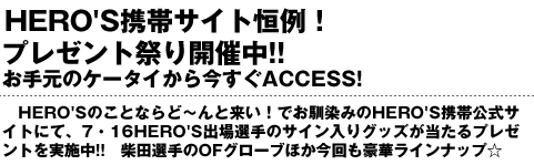 まずはHERO'S携帯サイトのコラムコーナー『武器的質疑応答 ARMS密書』にて、師匠の船木さんと毎回アブナイ(?)ネタで書きまくってくれている、柴田勝頼選手のサイン入りオープンフィンガーグローブ! これは実際に3・12『HERO'S』の山本戦で使用した、激レアな逸品! ぜひ携帯からアクセスしてGETしてほしい、ファン垂涎のアイテムです☆