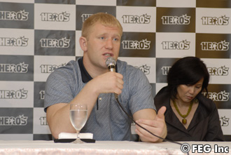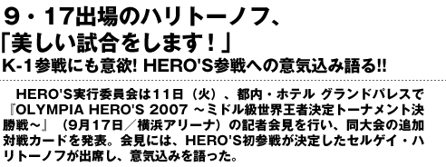 そして、ハリトーノフが登壇。ハリトーノフは「こうやってまた日本に戻ってこられて満足しています。今後、日本で長いキャリアが続くことを確信しています。すべてがうまくいくと思います。美しい試合を見せたいです」と挨拶すると、HERO'S参戦を決意した心境として「いつもK-1という組織自体が好きでよく見ていました。今回、PRIDEとの契約も終わり、HERO'Sに出ようと決意しました」と語った。現在、ハリトーノフはCLUB VOLK HANで多くのメンバーと練習を重ね、「イリューヒン・ミーシャ、ニコライ・ズーエフ、その他、レスリングのオリンピック王者、サンボの世界王者、柔道のオリンピック代表ら、各格闘技でトップを極めた選手と練習をしています」と、満足した練習環境にある様子。対戦相手のアリスター・オーフレイムの印象については「印象は何もないです。リング上を見ていてください」と不敵な笑みを浮かべると、今後のHERO'Sでの目標については「怪我も治りましたし、誰とでも闘う準備はできています。ヘビー級王者になりたいと思います」と語った。