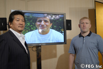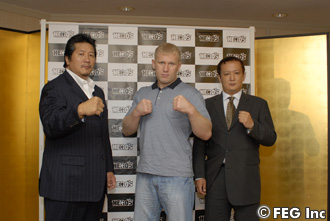 会見の冒頭、まずは谷川貞治FEG代表が、『OLYMPIA HERO'S 2007 ~ミドル級世界王者決定トーナメント決勝戦~』(9月17日/横浜アリーナ)の追加対戦カード、セルゲイ・ハリトーノフvsアリスター・オーフレイム、メルヴィン・マヌーフvsファビオ・シウバを発表。