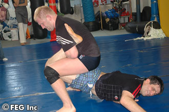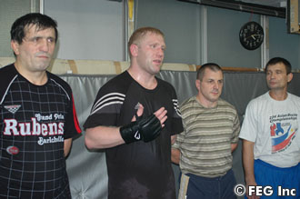 公開練習の開始時間より1時間ほど前から練習を行っていたハリトーノフ。その締めとばかりに集まった記者の前では、「CLUB VOLK HAN」主宰のヴォルク・ハン氏を相手にグラップリング中心のスパーリングを行った。