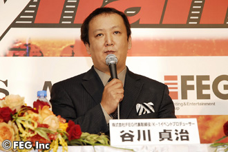 会見の冒頭、まずは谷川貞治FEG代表取締役が、今年で5回目となる『Dynamite!!』開催決定にあたり、「格闘技は人気のある一方で、正念場を迎えていると思います。今年の年末格闘技イベントがどうなるかは分かりませんが、やはりこの『Dynamite!!』が頑張らなければ、日本はおろか、世界中の格闘技界も元気がなくなるという自覚を持っております。格闘技界を代表して、原点である“打倒・紅白!”というものを忘れずに、今年は歌もバラエティも好調だと聞いていますので非常に強敵だと思いますが、多分今年もTBSさんに長時間放送枠を割いていただくと思いますので、それに応えるべく頑張りたいと思います」と決意表明。