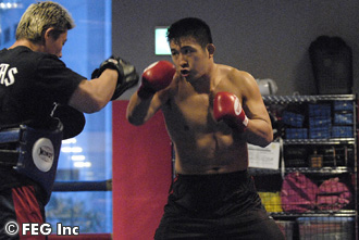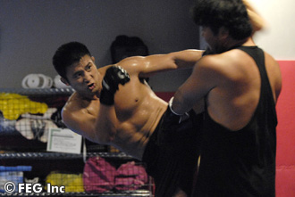 打撃のスパーでは、以前とは格段に違うパワーを見せた。重たいミドルがズドンッ!